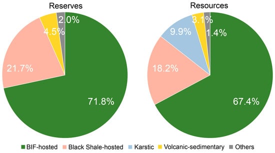African manganese deposits are diverse in terms of genesis, with various classifications having been summarized. Based on the resources data of significant manganese deposits in Africa and deposit types investigated by previous researchers [2,6,7,8,9], the primary metallogenic types of African manganese deposits are BIF-hosted, black shale-hosted, karst-hosted, and volcanic sedimentary deposits. The proportions of resources for these deposit types are approximately 67.4%, 18.2%, 9.9%, and 3.1%, respectively (Table 1; Figure 2). The following sections provide a detailed introduction to the geological characteristics and genesis of each of these deposit types.