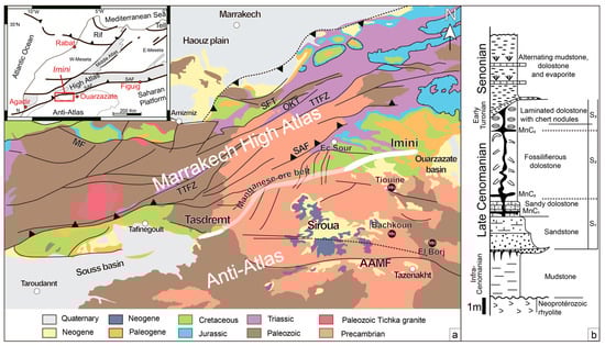 High Atlas and geological map of the Imini region in Morocco (a) and detailed stratigraphic log of Lantenois (western extremity of Imini) showing the Mn ore bodies (b) (after [28,29]). MF, Medinet Fault; TTFZ, Tizin’Test Fault Zone; SAF, South Atlas Front; OkT, Oukaimeden Thrust; SFT, Sidi Fars Thrust; AAMF, Anti-Atlas Major Fault.