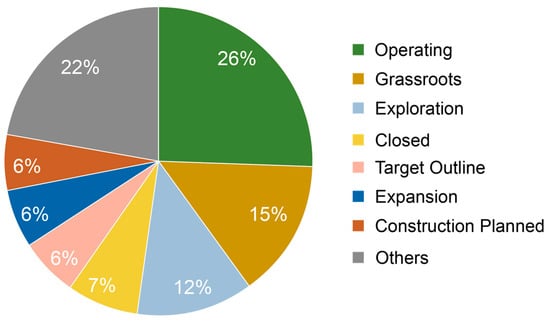 The current status of manganese exploration projects in Africa show 49% of manganese projects are active, then 46% are inactive, followed by 3% and 2%, which are in the stage of “Care and Maintenance” and “Temporarily On Hold” (Table S2). This indicates that nearly half of the manganese exploration projects are active, but a significant portion remain to be activated.