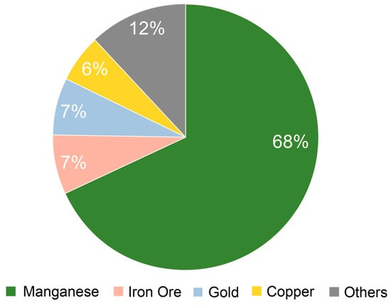 Hydrothermal manganese deposits form through the action of hydrothermal fluids influenced by magmatic activities and structural faults. Ores are usually vein-like or stockwork. The minerals include manganese oxides, carbonates, and silicates. Manganese can also occupy the lattice of other metals [7]. In Africa, hydrothermal manganese deposits are minor. Typical deposits include the Mkushi and Manza manganese deposits in Zambia. These deposits account for only 2.1% of Africa’s total manganese resources, and their manganese reserves represent about 1% of the world’s total manganese reserves [6,45].