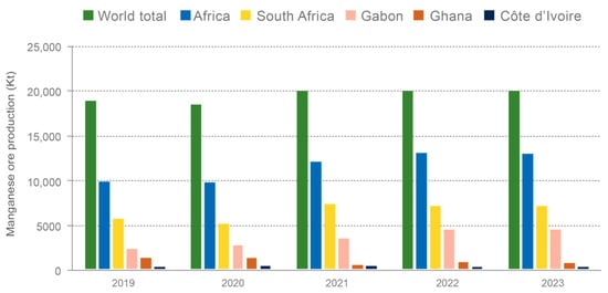 Manganese ore production in the world, Africa, and major countries in Africa (data from Table S5).