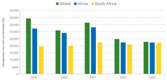 Manganese ore export volumes globally and from Africa and South Africa (data from Table S6).