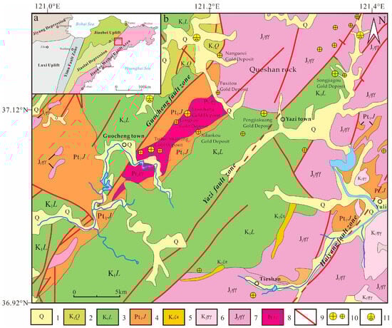 Figure 1. Regional geological map of the study area (revised according to references [41,42]). A sketch of the geotectonic location of the study area (a) and geological sketch of north-east margin of Jiaolai Basin (b) 1—Quaternary; 2—Lower Cretaceous Qingshan Group volcanic rock; 3—Lower Cretaceous Laiyang Group clastic rock; 4—Paleoproterozoic Jingshan Group khondalite series; 5—Early Cretaceous Era vein rock; 6—Early Cretaceous monzonite granite; 7—Late Jurassic monzonite granite; 8—Paleoproterozoic monzonitic granite; 9—Faults; 10—Rock gold deposits (the large circle denotes large deposits); 11—Placer gold deposits.