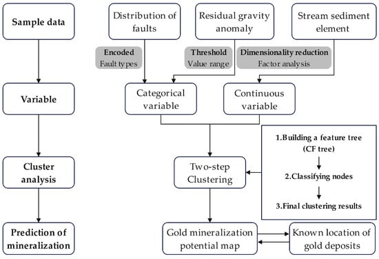 In machine learning, qualitative data is often termed “knowledge-driven”, while quantitative data is referred to as “data-driven” [3]. Geological big data encompasses a substantial amount of qualitative insights, quantitative assessments, and relational descriptions pertaining to geological phenomena and processes. This data exhibits characteristics that are poorly structured, semi-structured, or even unstructured [59]. The data process should consider the origin and structure of the data. In this study, the continuous variables are five uncorrelated components derived from factor analysis (FA) of 16 elements in the stream sediments. Categorical variables include the encoded residual gravity anomaly and fault distribution information, resulting in a total of seven variables. Finally, the two-step clustering method was used to map the high potential distribution locations of gold deposits. Figure 2 shows the methodological flowchart implemented in this study.