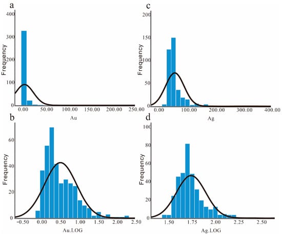 Figure 3. Frequency distribution histogram of Au (a,b) and Ag (c,d) before and after logarithmization.