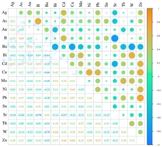 Figure 4. The correlation coefficients after logarithmization of 16 elements in the study area.