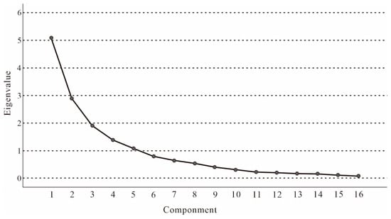 Table 1 shows a KMO value of 0.733, which exceeds the 0.5 threshold, indicating that there is a significant correlation between variables, thereby confirming the validity of Factor Analysis (FA). Furthermore, p < 0.05 indicates statistical significance. The number of principal components (N) is determined by variance and cumulative contribution rates; if the variance exceeds 1 and the cumulative contribution surpasses 70%, it indicates that N components capture over 70% of the original data’s information. Table 2 shows that the first five principal components have a minimum variance of 1.063 and a cumulative contribution rate of 77.189%. Figure 5 presents the scree plot of Factor Analysis.