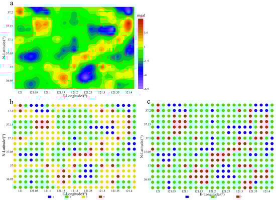 Moreover, this study used an interval method to convert the residual gravity anomaly from a continuous variable into a categorical variable, as shown in Figure 5. To preserve anomaly characteristics, the anomalies were divided into two scenarios. First, based on thresholds of −2, 0, and 1.5, they were categorized into four categories: (−∞~−2.0], (−2.0~0.0], (0.0~1.5], and (1.5~+∞), coded as 1, 2, 3, and 4. Second, according to thresholds of −1.5 and 1, they were divided into three categories: (−∞~−1.5], (−1.5~1.0], and (1.0~+∞), and assigned codes of 1, 2, and 3.