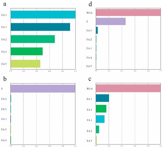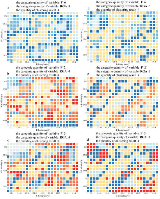 In Figure 8, the clustering effect is best in Figure 8a, followed by Figure 8c, and the worst is 8b. (1) Compared with Figure 8a, Figure 8b shows a poorer clustering effect of F; (2) When both variables are included in Figure 8d, RGA enhances the efficacy of F compared to that in Figure 8b.