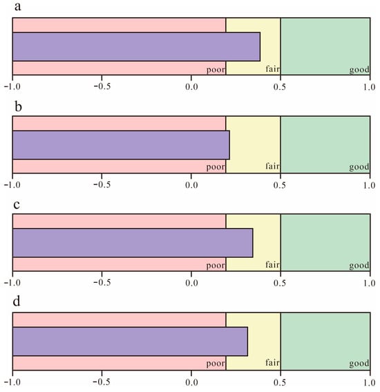 Figure 8. Comparison of quality of two-step clustering in the study area, differences in quantity of categorical variables, with zero categorical variables (a), one categorical variable fault (b), residual gravity anomaly (c) and two categorical variables (d).