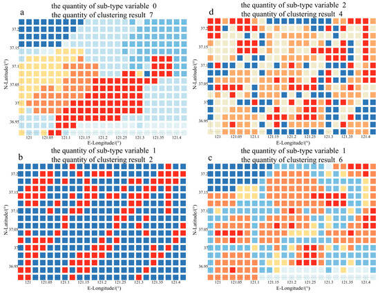 Figure 12 presents the results of six clustering variables, clearly showing the spatial distribution of faults in Figure 12a,c–f. It highlights significant differences between the Taocun fault in the northwest and the Haiyang fault in the southeast. In contrast, Figure 12b’s faults are less distinct due to their lower significance (see Figure 10b).