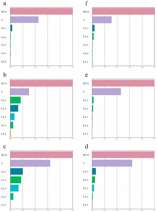 Figure 11 presents a comparative analysis of quality across six clustering variables, ranked in descending order as e > b > c > f > d > a. The top three clusters are e, b, and c, while cluster a exhibits the lowest quality. Notably, in 11e, F and RGA have categories of two and three respectively; conversely, for F and RGA in 11a, these values are six and four. This indicates that lower clustering performance is associated with more categories.