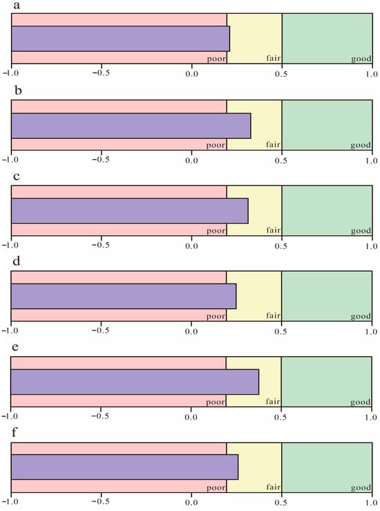 Figure 11. Comparison of quality of two-step clustering in the study area, differences in quantity of categories, with 6 × 4 categories (a), 6 × 4 categories (b), 2 × 4 categories (c), 3 × 3 categories (d), 2 × 3 categories (e) and 6 × 3 categories (f).