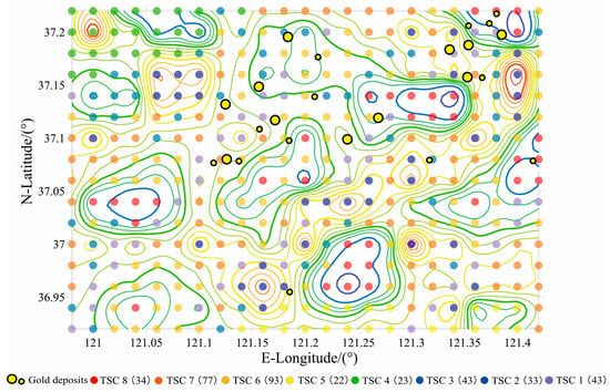 The cluster analysis revealed similar results for the two gold deposits areas in the central and northeastern regions. The northeastern area mainly contains the Songjiagou gold deposit, while the central area includes several deposits such as Guocheng-Liaoshang, Pengjiakuang, Longkou-Tudui, Tudui-Shawang, and Xilaokou. Previous research indicates that major deposits like Songjiagou, Pengjiakuang, Longkou-Tudui, and Liaoshang formed during the mid to late early Cretaceous period and are classified as mesothermal hydrothermal gold deposits [39].