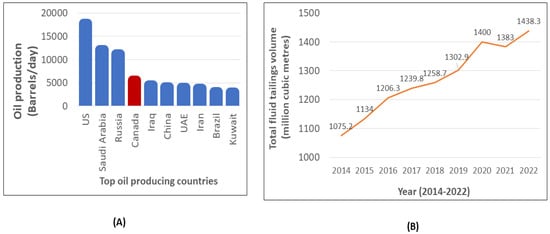 (A) World oil reserves by country, (B) fluid tailings volume over time (2014–2022).