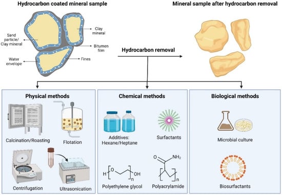 Metal recovery from minerals, such as zircon, monazite, pyrite, and anatase, from oil sand tailings poses a significant challenge due to bitumen coating on the mineral surface [46,47]. The humic content associated with organic-rich solids (clay minerals) tends to adsorb and securely bind bitumen to both internal and external aggregate surfaces [48,49]. Bitumen, being a heavy hydrocarbon with complex molecular structures, tends to form a cohesive and adhesive layer on the surface of mineral particles. This coating increases the surface tension of the minerals, influencing various aspects of their physical and chemical interactions, thereby impacting overall mineral behavior [50]. Therefore, it is necessary to remove the hydrocarbon coating from the mineral before extracting the metal (Figure 2). This section briefly discusses different methods utilized for the removal of residual bitumen and other hydrocarbons from the ore surface.