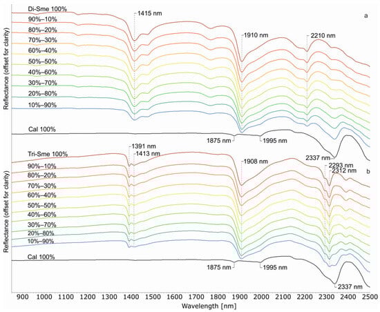 SWIR spectra of binary mixture samples of dioctahedral smectite with calcite (Di-Sme—Cal) (a), and trioctahedral smectite with calcite (Tri-Sme—Cal) (b). The spectra are offset for clarity.