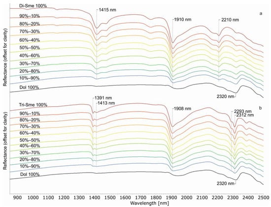 SWIR spectra of binary mixture samples of dioctahedral smectite with dolomite (Di-Sme—Dol) (a), and trioctahedral smectite with dolomite (Tri-Sme—Dol) (b). The spectra are offset for clarity.