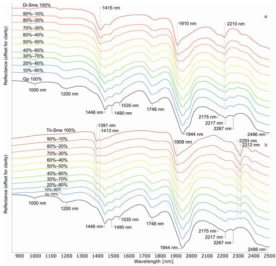 SWIR spectra of binary mixture samples of dioctahedral smectite with gypsum (Di-Sme—Gp) (a), and trioctahedral smectite with gypsum (Tri-Sme—Gp) (b). The spectra are offset for clarity.