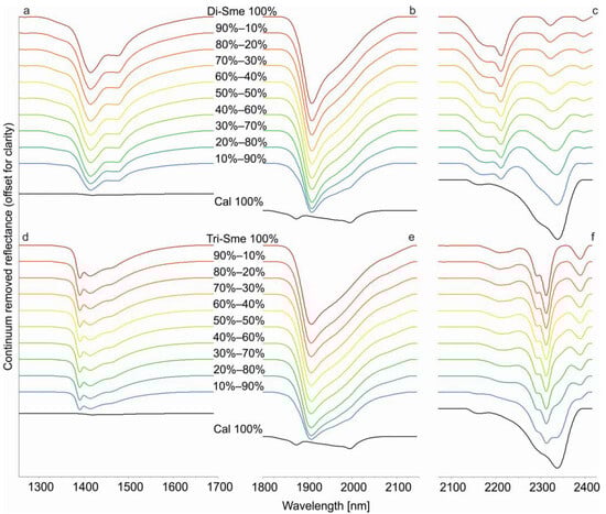 Continuum removed-spectra regions of binary mixture samples of dioctahedral smectite with calcite (Di-Sme—Cal) (a–c); and trioctahedral smectite with calcite (Tri-Sme—Cal) (d–f). The CR spectra are offset for clarity.