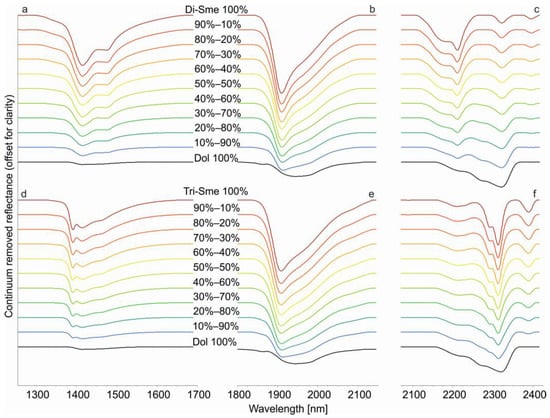 Continuum removed-spectra regions of binary mixture samples of dioctahedral smectite with dolomite (Di-Sme—Dol) (a–c); and trioctahedral smectite with dolomite (Tri-Sme—Dol) (d–f). The CR spectra are offset for clarity.