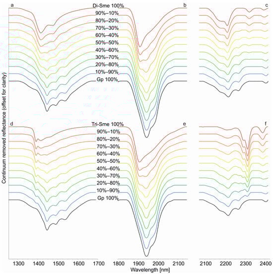 Continuum removed-spectra regions of binary mixture samples of dioctahedral smectite with gypsum (Di-Sme—Gp) (a–c); and trioctahedral smectite with gypsum (Tri-Sme—Gp) (d–f). The CR spectra are offset for clarity.