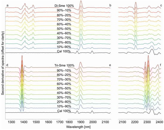 The second derivatives of the mixture sets are shown in Figure 7, Figure 8 and Figure 9 and Figures S15–S19. Calculating the second derivative of the original spectra enhances the comparison between mixtures, already described in studies such as Bishop et al. [37], Madejová et al. [38], Santamaría-López et al. [49], among others. This is because several bands and shoulders in the unmodified spectra are highlighted as second derivative peaks and tend to appear individualized from other adjacent peaks. Additionally, these second derivative peaks remain identifiable even when the proportions of minerals in the mixture change. For instance, while the Tri-Sme band at 2293 nm becomes blurred with increasing calcite content in the non-normalized spectrum (Figure 1b), a distinct second derivative peak appears at 2289 nm (Figure 7f), even in the sample containing only 10% smectite. Furthermore, within the same set, the positions of most significant peaks generally remain consistent, which aids in comparing spectra of different mixtures and accurately identifying the peaks. Despite these general improvements, the identification of mixed minerals after the second derivative is not free of difficulties in some of the sets studied. The most notable change in the smectite peaks with increasing proportions of non-clay minerals is a decrease in peak height (D2 value) (Figure S20). By monitoring the variations in D2 for each set of mixtures, we can infer differences in the ability of the non-clay minerals to attenuate the second derivative peaks of the smectites. Thus, the decrease in D2 follows either exponential or linear trends (particularly in mixtures with dolomite, gypsum, quartz, and feldspar) and is comparatively more asymptotic in mixtures with calcite (though not exclusively, as seen in the Tri-Sme + Fsp curve in Figure S20f). Asymptotic curves suggest that these non-clay minerals have a lower “opacification capacity”, meaning that a greater proportion of the non-clay mineral is required in the mixture for its effect on D2 to be significant.