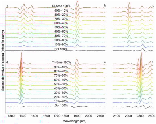 Second derivative of spectra regions of binary mixture samples of dioctahedral smectite with dolomite (Di-Sme—Dol) (a–c); and trioctahedral smectite with dolomite (Tri-Sme—Dol) (d–f). The second derivatives are offset for clarity.