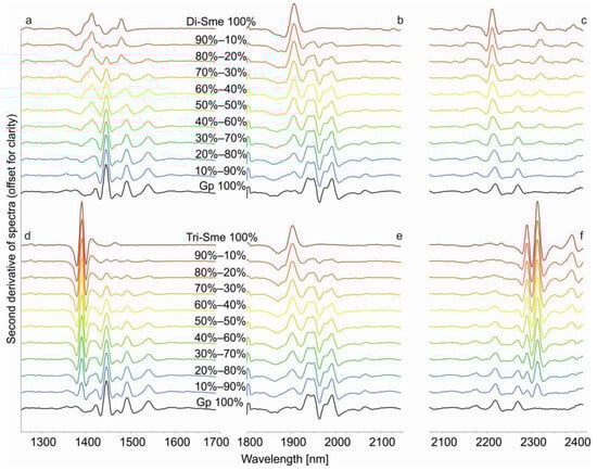 Second derivative of spectra regions of binary mixture samples of dioctahedral smectite with gypsum (Di-Sme—Gp) (a–c); and trioctahedral smectite with gypsum (Tri-Sme—Gp) (d–f). The second derivatives are offset for clarity.