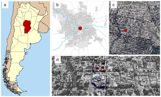(a). A map of Argentina highlighting Córdoba Province. (Source: Wikimedia Commons, https://commons.wikimedia.org/wiki/File:Provincia_de_C%C3%B3rdoba,_Argentina.png (accessed on 20 October 2024)). (b). A map of the neighbourhoods of Córdoba, Argentina; the urban area; and main watercourses (source: Wikimedia Commons, https://commons.wikimedia.org/wiki/File:Barrios_de_Cordoba_Argentina.svg (accessed on 20 October 2024))). (modified by the addition of a red dot indicating the position of the Jesuit building). (c). An aerial view of the Jesuit Block and refectory, Córdoba, Argentina. (Source: Google, https://www.google.com/maps/@-31.41828,-64.18405,5449m/data=!3m1!1e3!5m1!1e4?entry=ttu&g_ep=EgoyMDI0MDkxNy4wIKXMDSoASAFQAw%3D%3D (accessed on 20 October 2024))). Modified by the addition of a red dot indicating the Jesuit Block. (d). An aerial view of the Jesuit Block and refectory, Córdoba, Argentina. (Source: Google, https://www.google.com/maps/@-31.41953,-64.18702,1362m/data=!3m1!1e3?entry=ttu&g_ep=EgoyMDI0MDkxNy4wIKXMDSoASAFQAw%3D%3D (accessed on 20 October 2024)). Modified as part of the Manzana Jesuítica, and the refectory can be seen in colour.