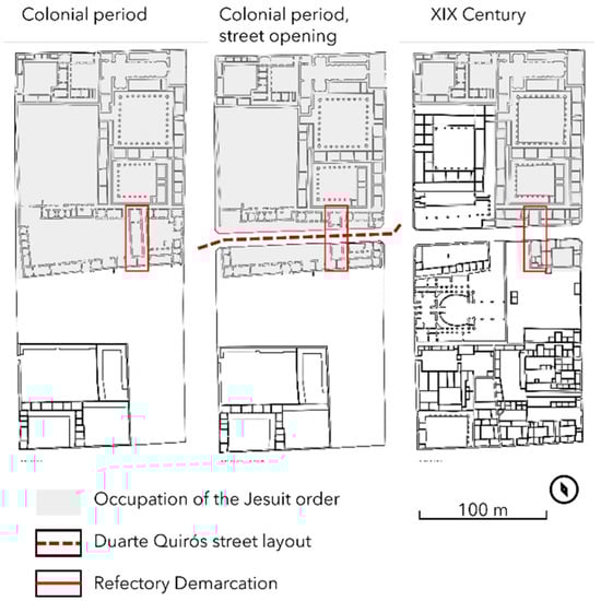 Towards the end of the 19th century, the complex was affected by the pressure of urban growth. In 1875, a new street was opened up (the Calle Duarte Quirós, formerly known as the Calle San Luis), which divided the original block into two, and affected a series of buildings located along its route. As a result, a new lateral façade was created in what had previously been part of the interior of the complex. Figure 2 shows the evolution of the complex from the colonial period to the 19th century.