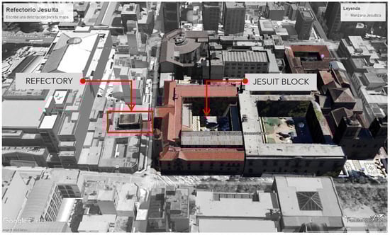 An aerial view of the Jesuit Block and refectory, Córdoba, Argentina. (Source: Google. https://earth.google.com/web/@-31.419074,-64.18743534,398.54470838a,299.13260052d,35y,-71.06868487h,34.75150664t,0r/data=CgRCAggBOgMKATBKDQj___________8BEAA (accessed on 20 October 2024). Image modified: Part of the Jesuit Block and the refectory can be seen in colour and annotated with arrows pointing to the “refectory” and “Jesuit Block”.