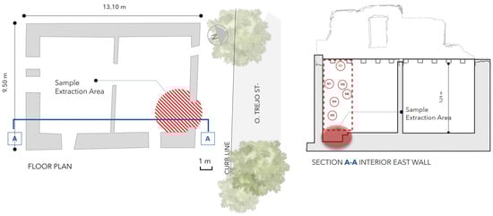 Schemes of the plan and section indicating both the location of the archaeological extraction of the samples (Floor Plan) and its hypothetical position in the wall, observable in section AA.