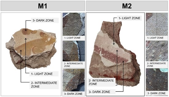 X-ray micro-diffraction (µ-XRD) was carried out on the paint layers of samples M1 and M2 (Figure 6), using a BRUKER D8 DISCOVER diffractometer (Bruker, Billerica, MA, USA) with a PILATUS3R 100K-A detector (Dectris, Baden, Switzerland), under the following conditions: T—25 °C, Cu Kα radiation (λ = 1.5406 Å), 50 KV voltage, and 1 MA intensity. Due to the non-destructive nature of this technique, the samples were not reduced to powder. The paint on the surface of M1 and M2 has yellowish and reddish tones, respectively. In both samples, 3 areas with different shades of paint were analysed (light, intermediate, and dark areas (Figure 6)), to assess possible differences in their mineralogical composition.