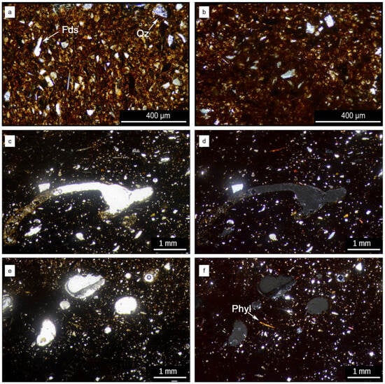 Photomicrographs of the samples taken with a transmitted light polarisation optical microscope. Brick fragments from samples M1 (a) and M2 (b), both with plane polars. Brick fragments from sample M1 with plane polars (c) and crossed polars (d). Brick fragments from sample M2 with plane polars (e) and crossed polars (f). The white arrows indicate Fds: feldspars; Qz: quartz; and Phyl: phyllosilicates.