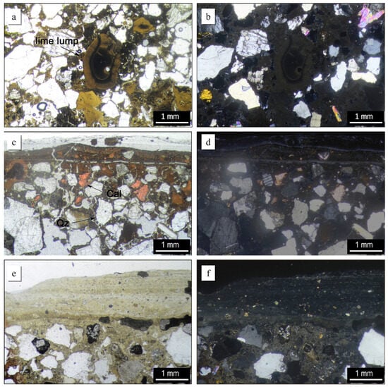 The mortar samples have a high proportion of aggregates. These are mostly natural, crushed quarzitic aggregates, and altered phyllosilicates and feldspars are present in some samples (Figure 8a–f). The larger aggregates tend to have an angular, irregular shape, while the smaller ones are mostly rounded. However, in the area closest to the surface and the paint layer, the aggregates have a more uniform size, especially in M1. Some of these aggregates have a calcitic composition, as revealed by the fact that they turn red when treated with alizarin red (Figure 8c). The mortar matrix is also predominantly calcitic (Figure 8c) and some lime lumps have been observed (Figure 8a,b). All mortar samples show alternating surface layers. Some of these are not stained red, which indicates their magnesian (or dolomitic) composition (Figure 8c).