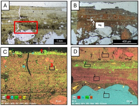 Polarised optical microscopy (A,B) and scanning electron microscopy (C,D) microphotographs of sample M1. The red box in (A) indicates the area observed under SEM and analysed by EDS. The black boxes in (C,D) are the areas analysed by EDS.