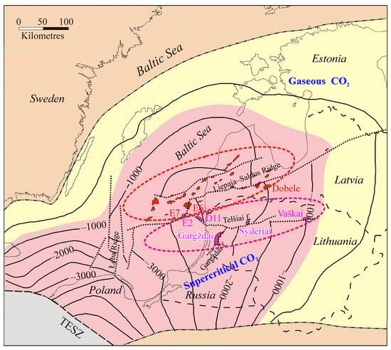 Based on extensive seismic survey and drilling activities, several different-scale uplifts have been identified in the Cambrian reservoir in Lithuanian territory, both onshore [37] and offshore [38]. About 20 oil shows and oil fields were discovered in the western part of the country. The depth of the oil fields is about 2 km, which proves the isolation of the reservoir. Only three offshore and two onshore structures were selected as prospective sites for the geological storage of CO2 emissions in the central and western parts of Lithuania (Figure 1) [39]. The Vaškai, Syderiai, and D11 structures are linked along the Telšiai fault, which is west–east-oriented. The westernmost uplift E2 is bounded by the Liepaja–Saldus Ridge, which controls almost all of the potential storage sites in Latvia, as discussed above. The largest site, the Gargždai elevation, is located in the second-largest fault zone in west Lithuania.