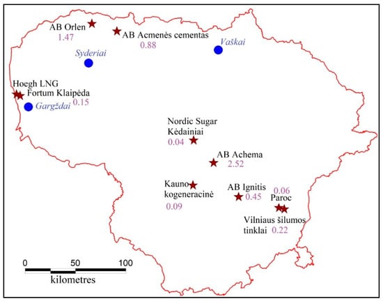 Ten major CO2 sources (brown stars) in Lithuania (their CO2 annual emissions in 2020, in Mt, are shown in pink). Major potential CO2 storage structures are also indicated (blue points). The structures and storage capacity of the Vaškai site can be found in Ref. [25] and the reassessed capacities of the Syderiai and Garždai structures can be found in the Introduction.