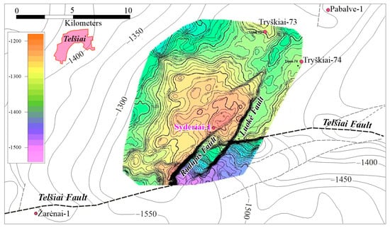 Depth (contour lines) of the top of the Lower Silurian key seismic reflector (b.s.l., m; depth −1190 m in well Syderiai-1). The 3D seismic block is highlighted (depth color scale). The Syderiai 3D seismic block was studied to specify the deformation of the Telšiai fault and the branching small-scale tectonic features. The adjacent wells are shown.
