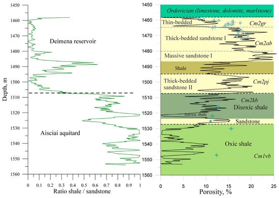 Left—calculated ratios of sandstones and shales, based on a well gamma-ray wirelog. Right—porosity defined in drill core samples (blue points) and interpreted by well logs (curve). Deimena RSt. comprises Giruliai, Ablinga, and Pajūris Fms., and Aisčiai Group comprises Kybartai and Rausvė Fms. Cambrian units are overlain by lowermost Ordovician carbonate cap rocks.