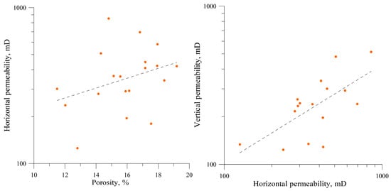 Left—porosity vs. horizontal permeability of sandstones in the upper part of Deimena RSt. (lower part of reservoir was not sampled). Right—vertical vs. horizontal anisotropy of sandstones, ratio of approximately 0.7. Well: Syderiai-1.