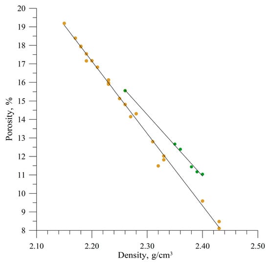 The density of sandstones is commonly ignored as a parameter of minor importance. The average density of sandstones is 2270 kg/m3, which is typical for moderately buried compacted sandstones. The strong statistical correlation found between sandstone density and porosity was striking, and a strong negative statistical correlation was found for the sample set (the R-squared value was 0.99) (Figure 6). In turn, this correlation pointed to the superlative control of the quartz cementation over the sandstones’ porosity. Also, the studied clayey siltstones attributed to the Kybartai and Rausvė RSts. showed a systematic increase in density of approximately 30 kg/m3, compared to the sandstones (Figure 6).