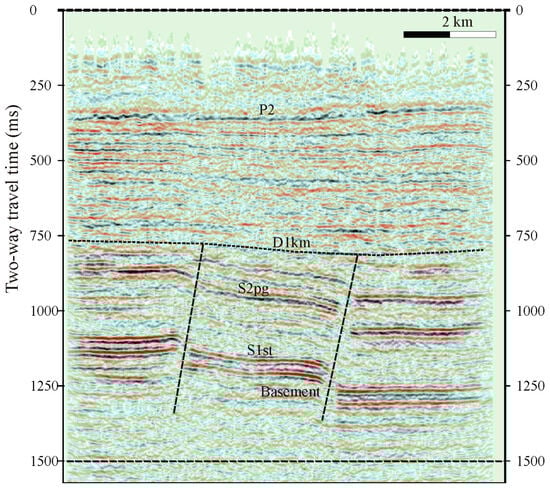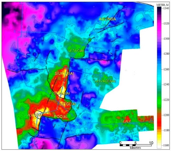 The spatial precision of the interpreted horizon was determined by the type of seismic data (2D or 3D) and by bin size, which was usually 12.5 m for 2D seismic lines, and 25 × 25 m for 3D seismic volumes. The interpreted time horizons were converted to depth horizons using the site-updated models of horizon velocity (the model of average-velocity-to-horizon). Seismic-to-well ties were used to relate well logs representing the geological section to seismic sections and to identify rock interfaces at which seismic reflections originated. The seismic-to-well ties provided a synthetic seismic trace, which visually related to the real seismic data; thus, this demonstrated the relationship between stratigraphic and lithological boundaries and an actual seismic reflection section. The well Purmaliai-2 was selected for the seismic-to-well tie in the Gargždai area and the well Syderiai-1 was used as the reference well in the Syderiai area. The velocity model was obtained using reference wells in the two studied areas. The seismic interpretation software LMKR Geographix 2017.3 was used for the seismic data interpretation, which included the horizon interpretation, seismic-to-well tie, digitization of the scanned map, and creation of the final map. LMKR Geographix and Matplotlib were used for drafting the figures [46].