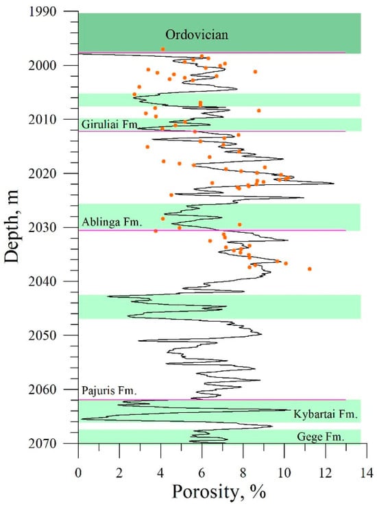 Most of the samples were collected from the Giruliai and Ablinga Fms., which comprise the most prospective part of the reservoir within the oil fields (Figure 9 and Figure 10). The authigenic quartz cementation reduces the reservoir quality in west Lithuania. The average porosity, horizontal permeability, anisotropy of permeability, and rock density of different formations are presented (Table 2). The average porosity is as low as 4.74% and the permeability is 9.33 mD in the Giruliai Fm.; the sandstones of the Ablinga Fm. have a slightly higher porosity of 6.10% and a lower permeability of 6.88 mD.