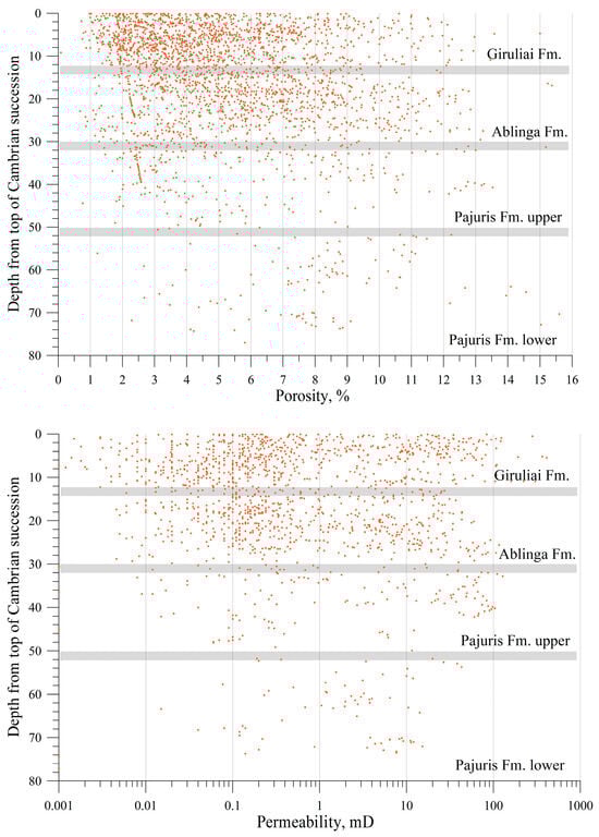 Porosity vs. depth (upper figure) and permeability vs. depth (lower figure) of sandstones of Deimena RSt. in Gargždai Elevation (the boundaries of the Giruliai, Ablinga, and Pajūris formations are marked by shading which shows some scattering in the depth of formations). Number of samples (N) = 2724.