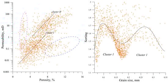 Left—porosity vs. permeability of Deimena RSt. The anomalous permeability is likely affected by the fracturing of low-porosity sandstones (pink sample subset). Also, high-porosity samples were selectively damaged by drilling mud (blue sample subset). Right—grain size vs. sorting of sandstones. Sandstones were collected from west Lithuanian wells (depth: 1670–2229 m, number of samples: 1661). Curve fitting with a fifth-degree polynomial is indicated.
