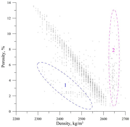 The highest density of sandstones is reported in the Giruliai Fm. (2530 kg/m3), which showed a minor decreasing trend in density (from 2490 to 2470 kg/m3) in the Ablinga and Pajūris Fms. This is likely related to the variable quartz cementation, which is the main parameter controlling reservoir quality. It has been extensively studied in the west Lithuanian oil fields [58,66]. Generally, three clusters were discernible in the plot of density vs. porosity. The most quartz-cemented, Cluster 2, had the highest-density sandstones (Figure 11). Cluster 1 had the low-density trend, implying the admixture of a clay fraction in the sandstones (possibly from drilling mud). Cluster 2 was classified as fractured samples. Also, the discordance in the statistical correlation of two parameters is a common phenomenon in large databases.