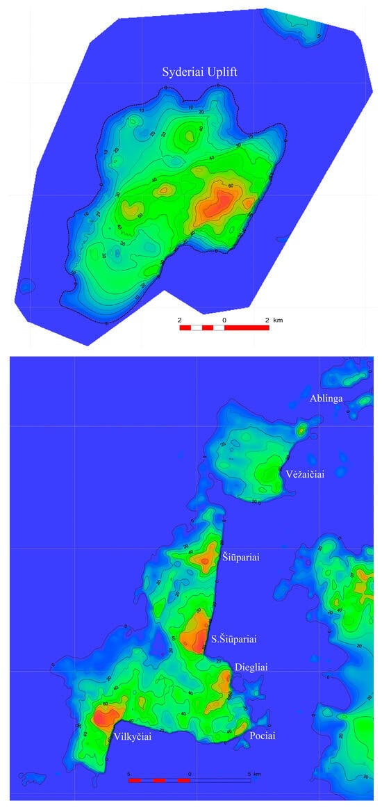 The Gargždai elevation is the largest tectonic uplift in Lithuania. The first discovery of oil was recorded in the well Šiūpariai in 1968 (Figure 7). More than 50 wells were drilled at this elevation, leading to the discovery of six oil fields in the 1970s. The northernmost Vėžaičiai oil field is only partially connected to the major elevation to the south (which contains Šiūpariai, South Šiūpariai, Diegliai, Pociai, and the largest oil field, Vilkyčiai). The Ablinga oil field is a small, isolated structure, terminating the Gargždai elevation in the north (Figure 7).