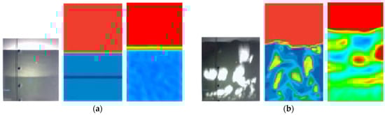 Figure 3a,b show the literature experimental results, the literature numerical simulation results, and the computational results of the model developed in this paper at 0 s and 4 s, respectively. The orange and red regions in the calculation results are bubble cavities, and the blue region is the particle aggregation area; 0 s is the initial time of simulation, when particles accumulate at the bottom of the bed. The experimental results of the literature [